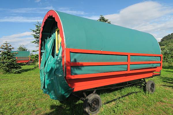 在這個沒水沒電的篷車中,我體會到最原始的生活,房間裡的電燈是燒煤氣,真的是非常的大自然,沒有污染,連水龍頭的水一開,都是甜的。而篷車的外觀看起來非常的特別,內部也不容小覷,有小巧的瓦斯爐(但要自己用火柴生火),還有沙發(可以併為2張雙人床),還有一個活動式沙發床(可以變為Bunker Bed),還有許多櫃子(放盤子,吊衣服,還有放床單/棉被/毛毯),在這麼一個小空間內,真的是善用每一個空間,把每一個空間都物盡其用,雖然空間不大,但是很溫馨。